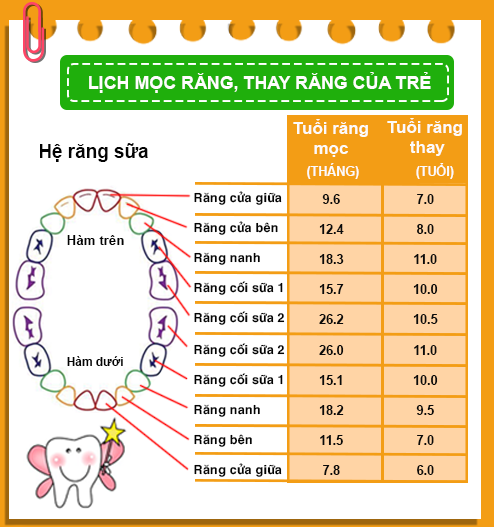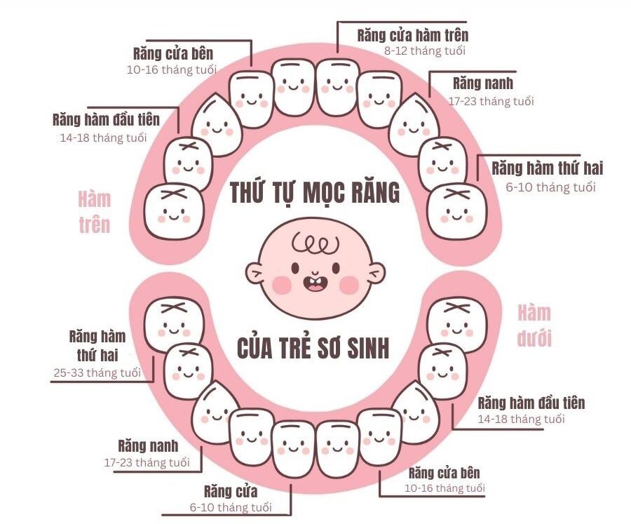 Răng sữa thường bắt đầu mọc khi trẻ từ 6 – 10 tháng tuổi và đến khoảng 3 – 4 tuổi, bé sẽ có đầy đủ 20 chiếc răng sữa. Quá trình thay răng thường diễn ra từ khoảng 6 tuổi và theo đúng trình tự mọc răng trước đó.