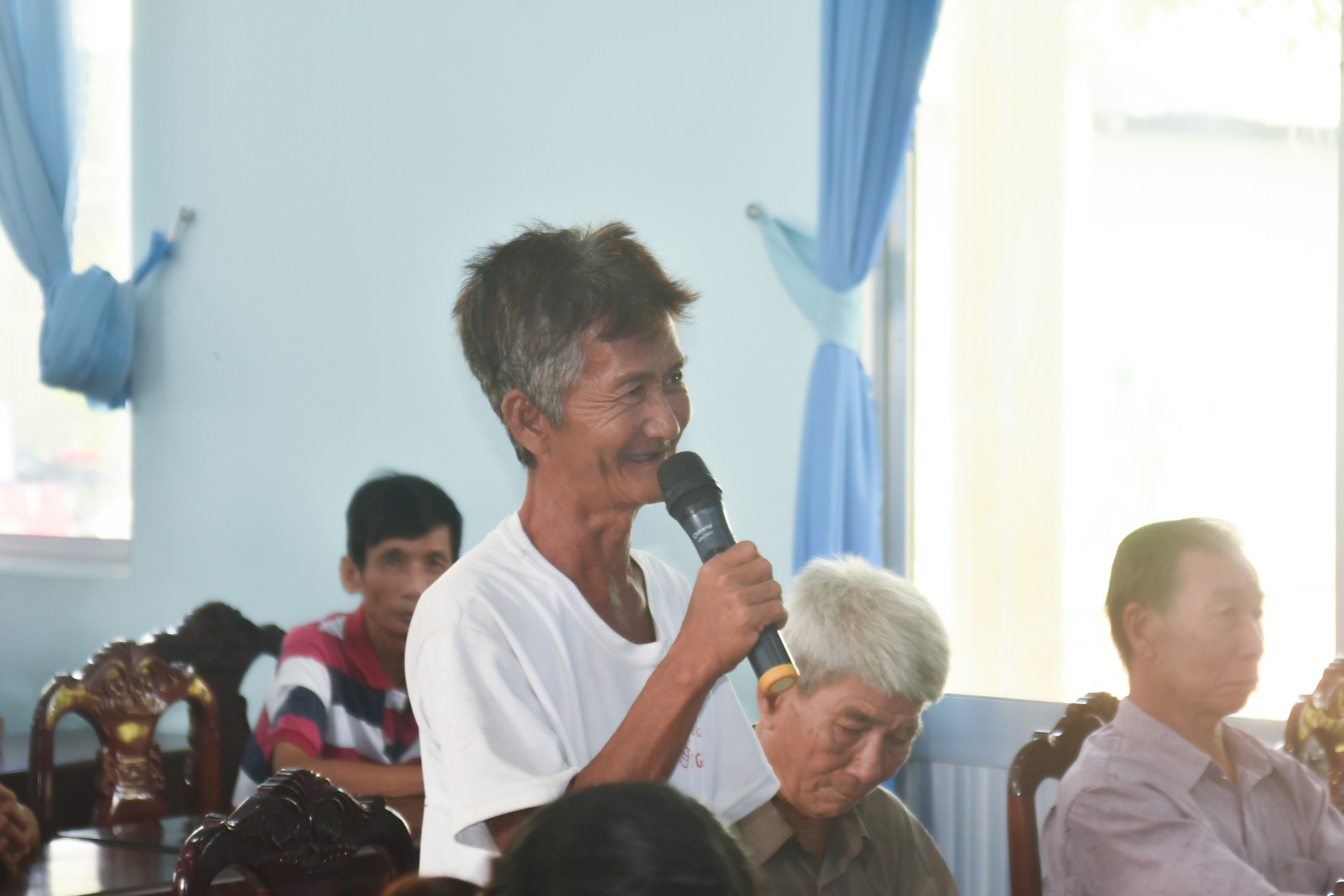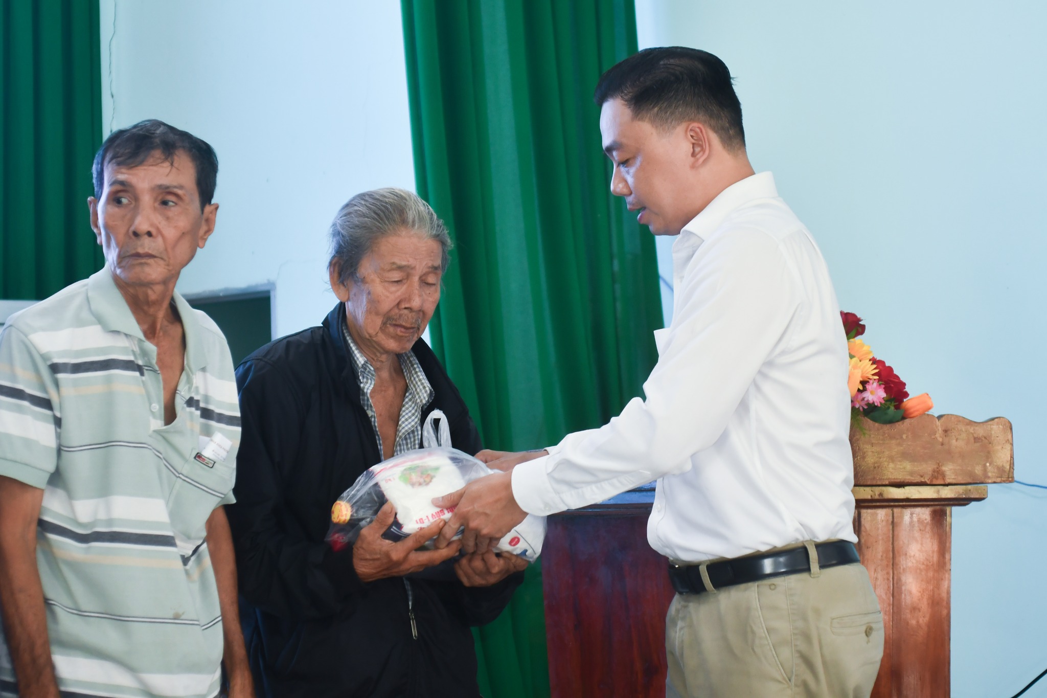 Không chỉ dừng lại ở những món quà, BS. Thành đã dành thời gian thăm hỏi, lắng nghe những tâm tư, nguyện vọng của bà con. Những cái bắt tay ấm áp và lời chia sẻ chân tình chính là động lực để